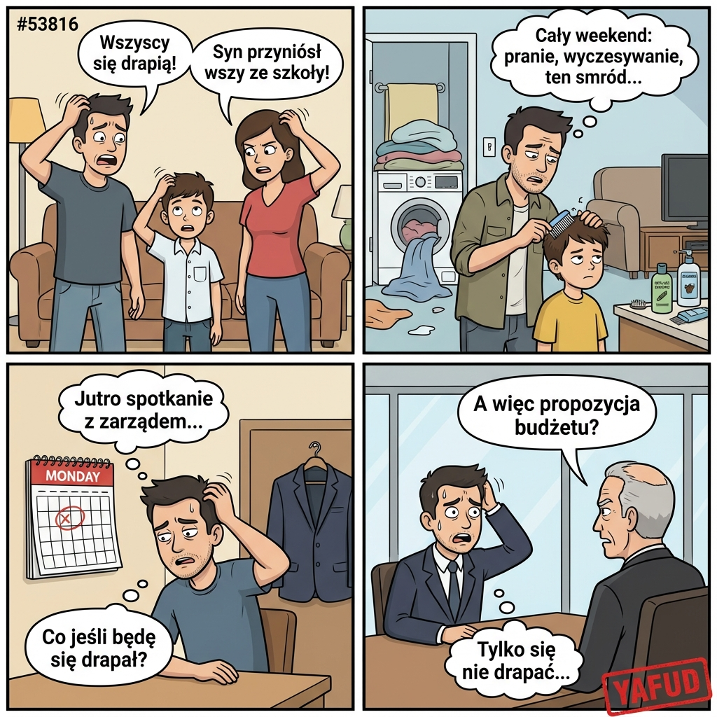 Mój syn przyniósł ze szkoły wszy. Dowiedzieliśmy się o tym dopiero, gdy cała rodzina zaczęła się drapać. Spędziłem cały weekend na praniu pościeli, wyczesywaniu włosów i smarowaniu głów śmierdzącym preparatem. Najgorsze, że w poniedziałek mam ważne spotkanie z zarządem i boję się, że będę się drapał przy prezesie. YAFUD«Poprzednia wpadka