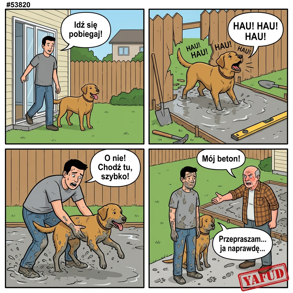 Wypuściłem psa na ogród, żeby się wybiegał. Po chwili usłyszałem szczekanie i pisk. Okazało się, że pies znalazł dziurę w płocie i wpadł do świeżo wylanego betonu u sąsiada. Musiałem go wyciągać, niszcząc sobie buty i ubranie, a potem tłumaczyć się wściekłemu sąsiadowi. YAFUD«Poprzednia wpadkaNastępna wpadka »