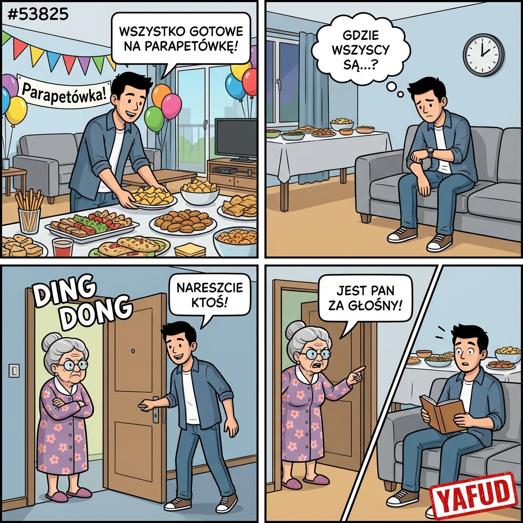 Wprowadziłem się do nowego mieszkania. Zaprosiłem sąsiadów na parapetówkę. Nikt nie przyszedł, oprócz starszej pani z dołu, która przyszła tylko po to, żeby powiedzieć, że jestem za głośno, mimo że siedziałem sam i czytałem książkę, czekając na gości. YAFUD«Poprzednia wpadka