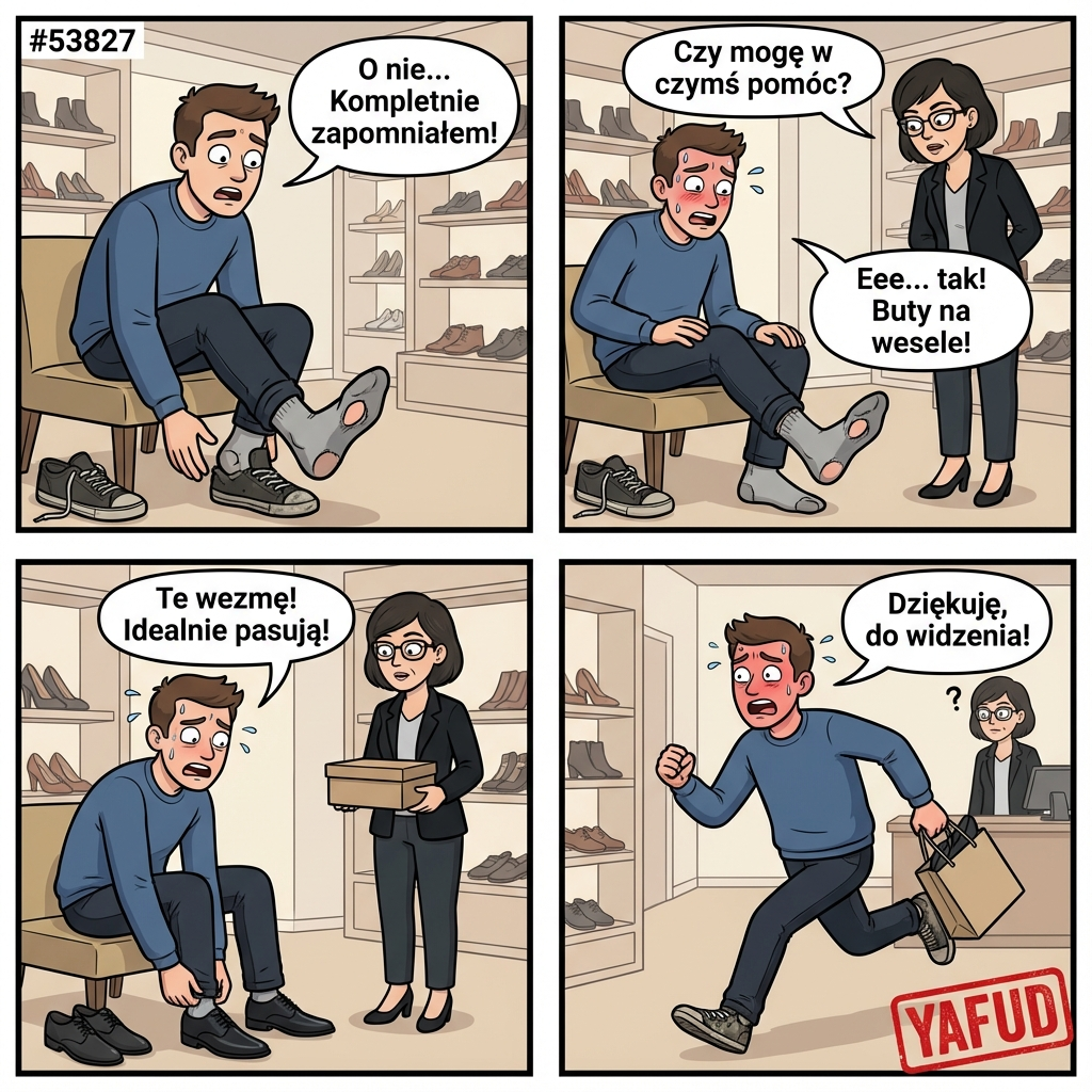 Poszedłem do sklepu obuwniczego przymierzyć buty na wesele. Zdjąłem swoje stare adidasy i zorientowałem się, że mam na skarpetce wielką dziurę, przez którą wystaje duży palec. Sklepowa akurat podeszła zapytać, czy w czymś pomóc, i spojrzała wymownie na moją stopę. Ze wstydu kupiłem pierwsze lepsze buty bez dłuższego przymierzania i uciekłem ze sklepu. YAFUD«Poprzednia wpadkaNastępna wpadka »