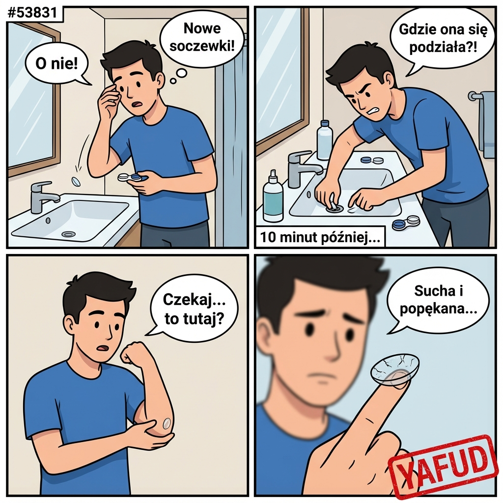 Kupiłem nowe soczewki kontaktowe. Podczas zakładania jedna upadła mi na umywalkę. Szukałem jej przez 10 minut. Znalazłem ją przyklejoną do mojego łokcia, ale była już sucha i popękana. YAFUD«Poprzednia wpadkaNastępna wpadka »
