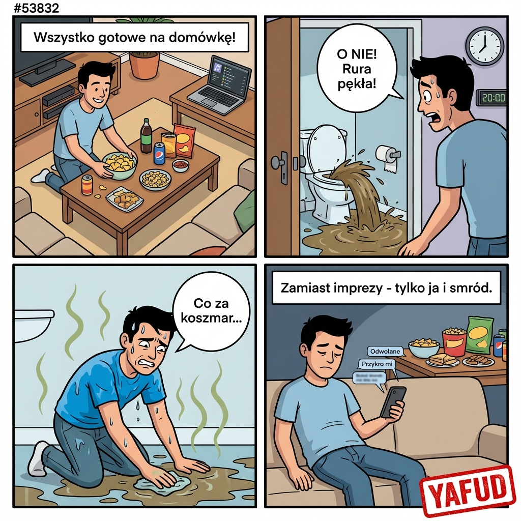 Organizowałem domówkę dla znajomych. Przygotowałem playlistę, jedzenie i drinki. O 20:00, godzinę przed przyjściem gości, pękła rura w pionie kanalizacyjnym w bloku. Z toalety zaczęły wybijać ścieki. Zamiast imprezy, miałem wieczór ze ścierką i smrodem, odwołując wszystkich gości SMS-em. YAFUD«Poprzednia wpadka