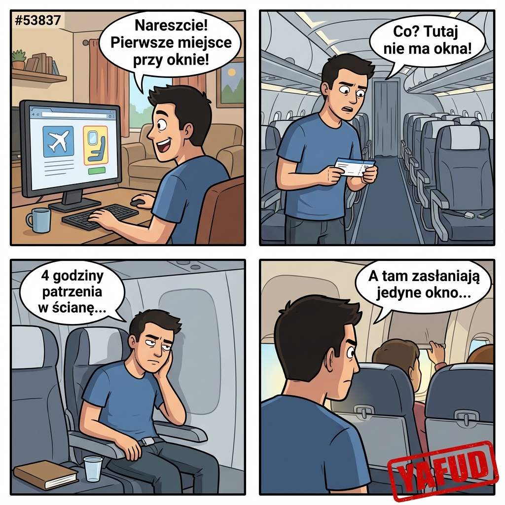 Leciałem samolotem na wakacje i po raz pierwszy wykupiłem miejsce przy oknie, żeby podziwiać widoki. Kiedy wszedłem na pokład, okazało się, że moje miejsce 'przy oknie' to w rzeczywistości rząd, gdzie zamiast okna jest ściana kadłuba. Przez 4 godziny lotu gapiłem się w szary plastik, podczas gdy pasażer przede mną zasłonił swoje okno, bo raziło go słońce. YAFUD«Poprzednia wpadkaNastępna wpadka »