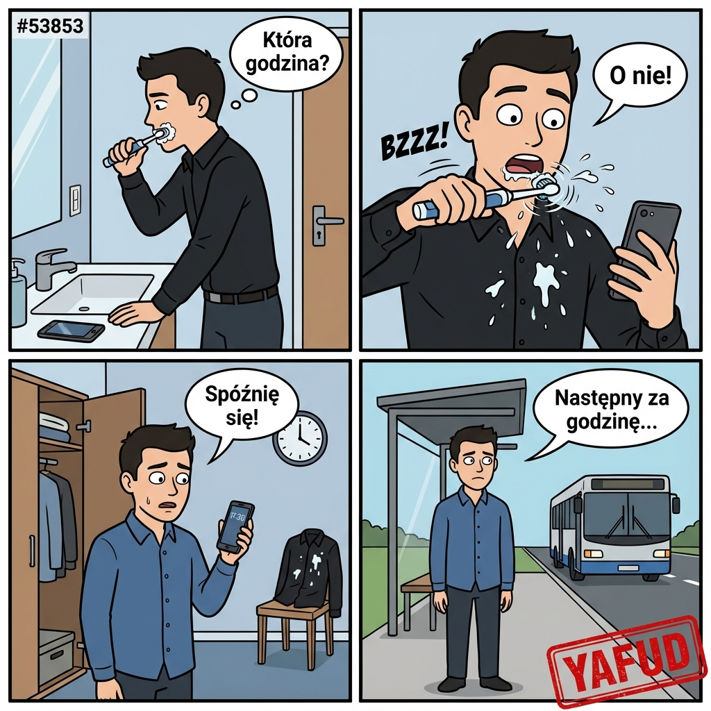 Dzisiaj rano myłem zęby elektryczną szczoteczką. Chciałem sprawdzić godzinę na telefonie i odruchowo wyjąłem szczoteczkę z ust, nie wyłączając jej. Obrotowa głowica rozchlapała pastę z wodą prosto na moją świeżo wyprasowaną, czarną koszulę. Musiałem się przebierać, przez co spóźniłem się na autobus, który jeździ raz na godzinę. YAFUD«Poprzednia wpadkaNastępna wpadka »