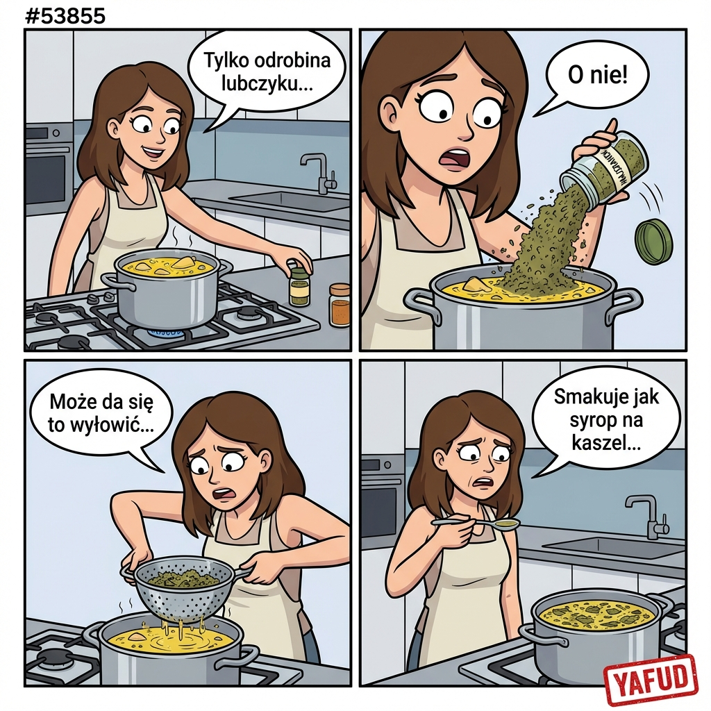 Gotowałam rosół na niedzielny obiad dla teściów. Chciałam go tylko doprawić odrobiną lubczyku. Sięgnęłam po słoiczek z przyprawami, ale wieczko było niedokręcone. Do garnka wpadła cała zawartość słoika z suszonym majerankiem, który stał obok i który potrąciłam. Próbowałam to wyłowić, ale zupa smakowała jak wywar z ziół na kaszel i nie dało się jej uratować. YAFUD«Poprzednia wpadkaNastępna wpadka »