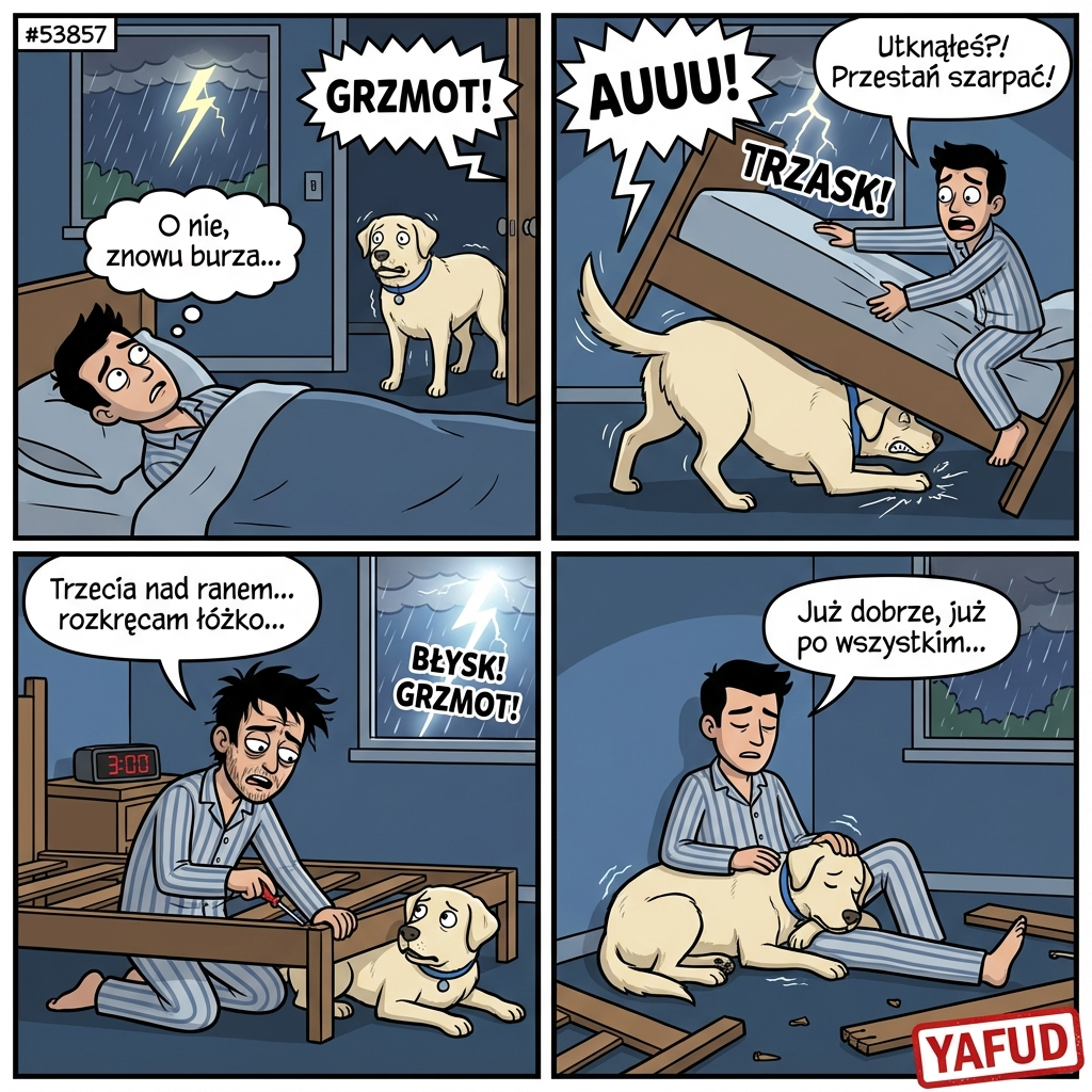 Mój pies panicznie boi się burzy. W nocy przyszła nawałnica. Pies ze strachu próbował schować się pod moim łóżkiem, ale utknął. Zaczął wyć i szarpać się w panice, podnosząc całe łóżko ze mną na wierzchu. Musiałem o 3 nad ranem rozkręcać ramę łóżka, żeby uwolnić przerażonego labradora, podczas gdy za oknem waliły pioruny. YAFUD«Poprzednia wpadkaNastępna wpadka »