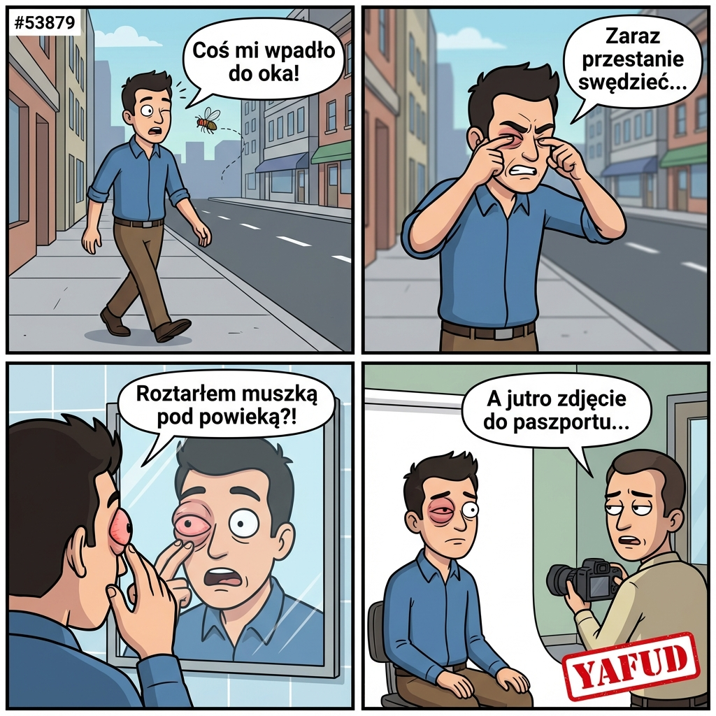 Wracając z pracy, poczułem, że coś wpadło mi do oka. Zacząłem trzeć powiekę, ale to tylko pogorszyło sprawę. Okazało się, że to była muszka owocówka, którą skutecznie roztarłem pod powieką. Oko spuchło mi tak bardzo, że wyglądałem, jakbym dostał pięścią w twarz, a następnego dnia miałem robione zdjęcie do paszportu. YAFUD«Poprzednia wpadkaNastępna wpadka »
