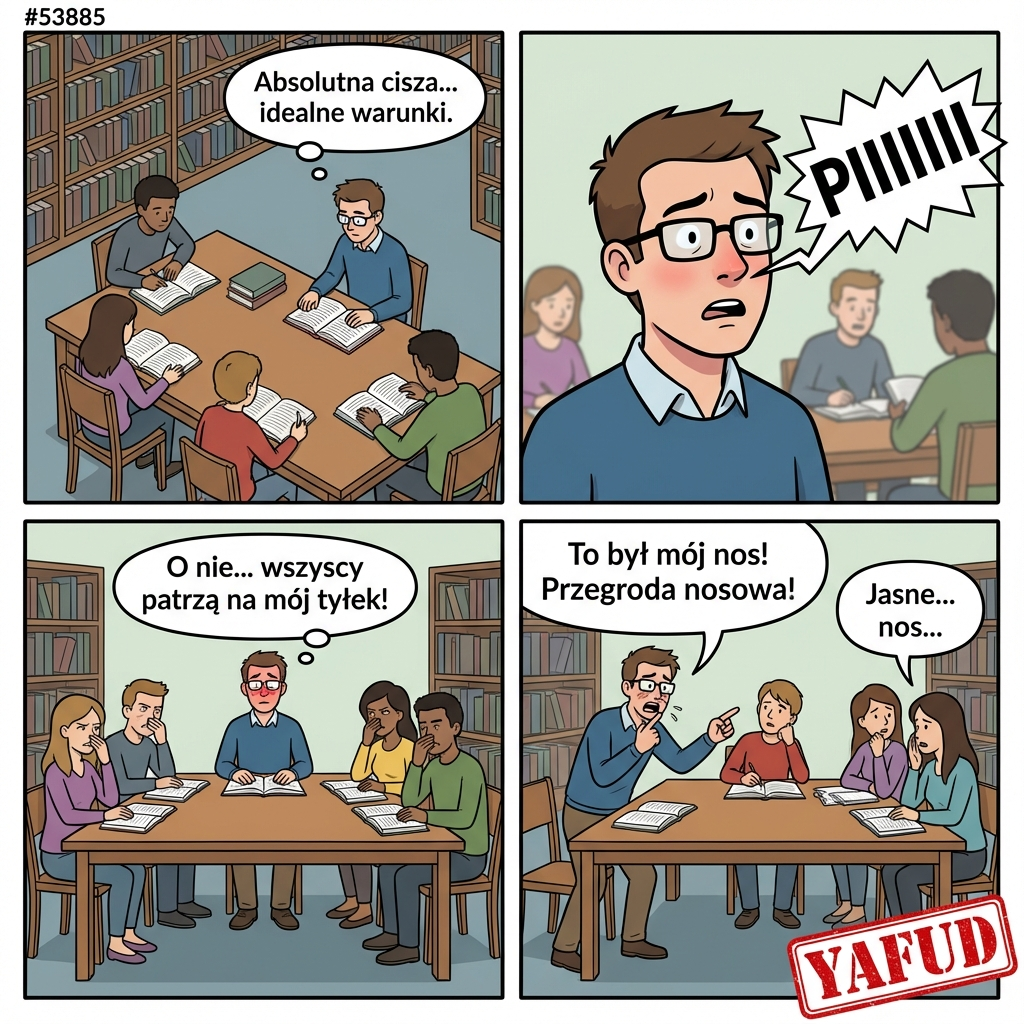 Mam lekkie skrzywienie przegrody nosowej, co powoduje, że czasem głośno oddycham. Dzisiaj w bibliotece, w absolutnej ciszy, mój nos wydał dźwięk przypominający cichy, ale wyraźny piskliwy 'bąk'. Wszyscy przy moim stole spojrzeli na mój tyłek z obrzydzeniem. Próba wytłumaczenia, że to nos, tylko pogorszyła sprawę. YAFUD«Poprzednia wpadkaNastępna wpadka »