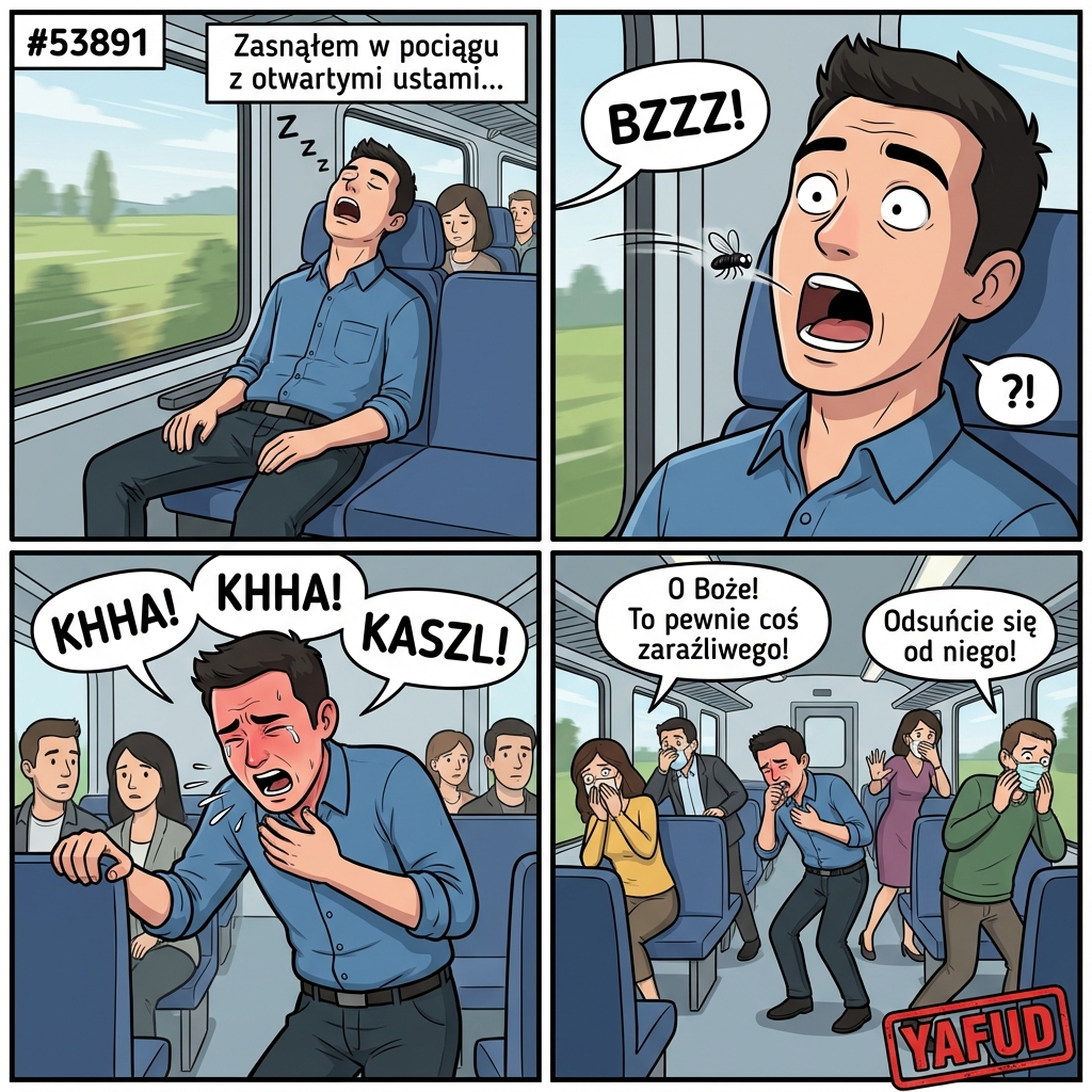 Jechałem pociągiem w wagonie bezprzedziałowym. Zasnąłem z otwartymi ustami. Obudziłem się, gdy mucha wleciała mi do gardła. Zacząłem się krztusić i kaszleć tak gwałtownie, że ludzie dookoła odsunęli się ode mnie, myśląc, że mam jakiś atak zaraźliwej choroby. YAFUD«Poprzednia wpadkaNastępna wpadka »