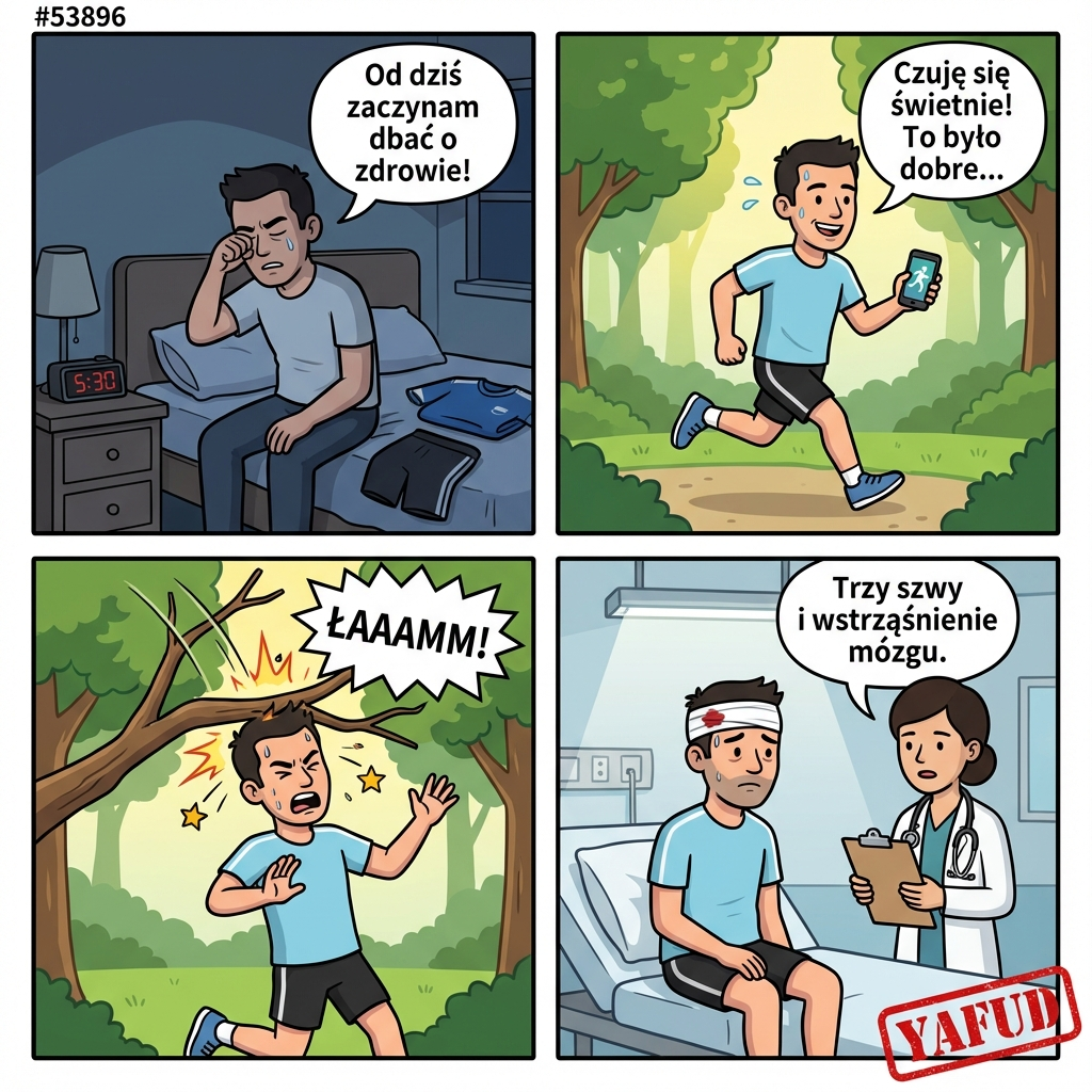 Postanowiłem zacząć biegać rano przed pracą dla zdrowia. Wstałem o 5:30, ubrałem się i ruszyłem do parku. Po kilometrze biegu, gdy czułem się świetnie, na moją głowę spadła wielka, sucha gałąź, która odłamała się z drzewa. Skończyło się na wizycie na SORze, trzech szwach i wstrząśnieniu mózgu zamiast endorfin. YAFUD«Poprzednia wpadka
