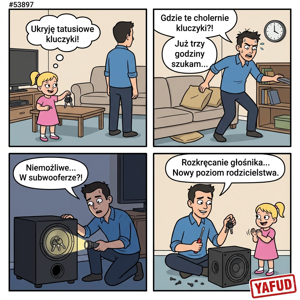 Moja dwuletnia córka znalazła moje kluczyki do samochodu i postanowiła je 'schować'. Szukałem ich przez trzy godziny, spóźniając się do pracy i denerwując. Znalazłem je wieczorem wewnątrz subwoofera kina domowego, wrzucone przez otwór bass-reflex. Musiałem rozkręcić głośnik, żeby je wyjąć. YAFUD«Poprzednia wpadka