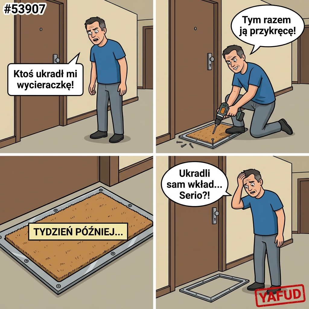 Mieszkam na parterze. Ktoś ukradł mi wycieraczkę spod drzwi. Kupiłem nową, przykręciłem ją do podłogi. Tydzień później ktoś ukradł sam wkład kokosowy, zostawiając przykręconą ramkę. YAFUD«Poprzednia wpadkaNastępna wpadka »
