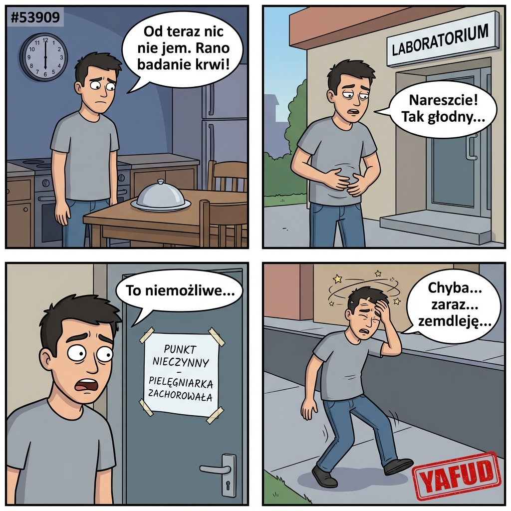 Miałem ważne badanie krwi, na które trzeba przyjść na czczo. Nie jadłem nic od 18:00 poprzedniego dnia. Rano w laboratorium okazało się, że pielęgniarka, która pobiera krew, zachorowała i punkt jest nieczynny. Prawie zemdlałem z głodu w drodze powrotnej. YAFUD«Poprzednia wpadkaNastępna wpadka »