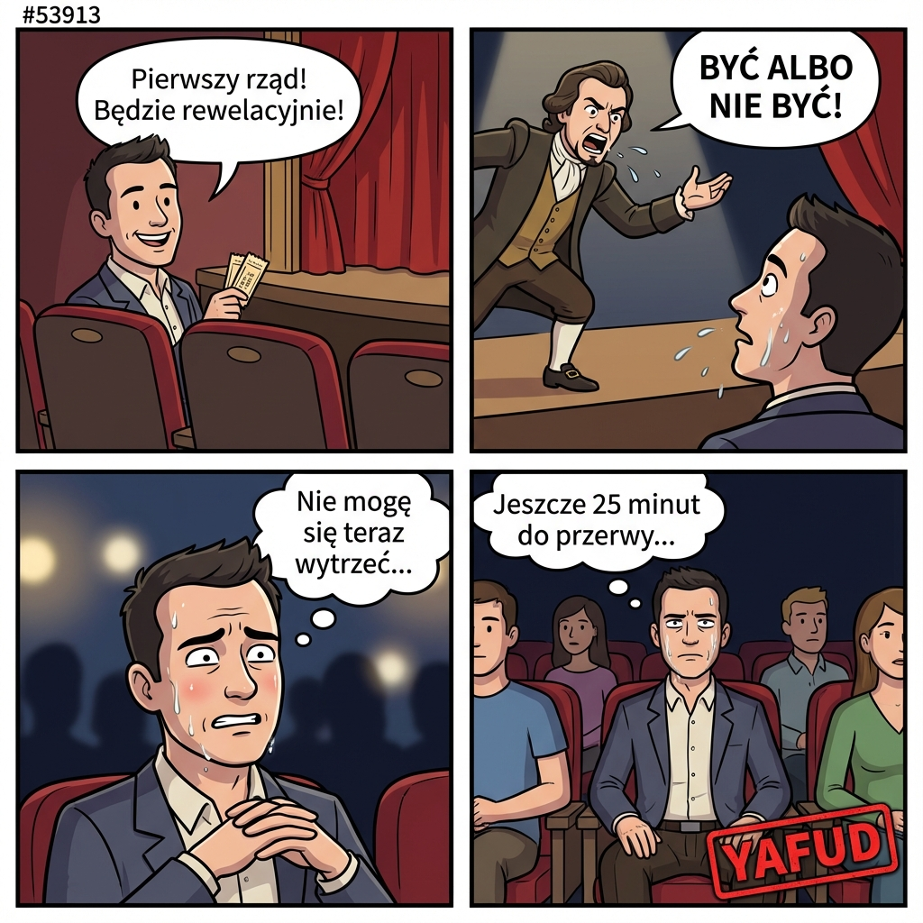 Kupiłem bilety do teatru na pierwszy rząd. Aktor grający główną rolę tak bardzo wczuł się w monolog, że opluł mnie, wykrzykując swoje kwestie. Nie mogłem się wytrzeć, żeby nie zrobić sceny, więc siedziałem z mokrym policzkiem przez pół godziny do przerwy. YAFUD«Poprzednia wpadkaNastępna wpadka »
