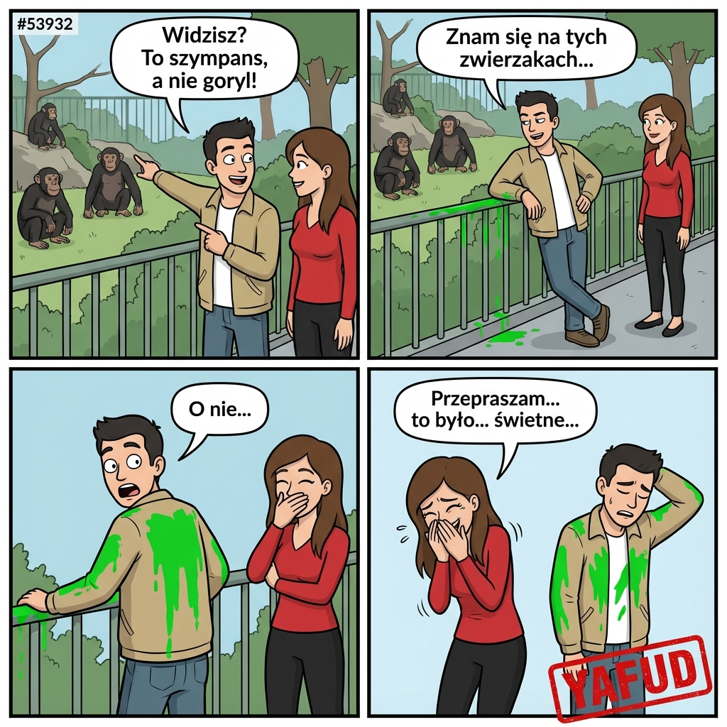 Na pierwszej randce poszliśmy do zoo. Chcąc zaimponować dziewczynie wiedzą przyrodniczą, oparłem się nonszalancko o barierkę przy wybiegu dla małp. Nie zauważyłem, że barierka jest świeżo pomalowana na zielono. Całe plecy mojej jasnej kurtki i rękawy zostały w zielone pasy. Dziewczyna z trudem powstrzymywała śmiech. YAFUD«Poprzednia wpadkaNastępna wpadka »
