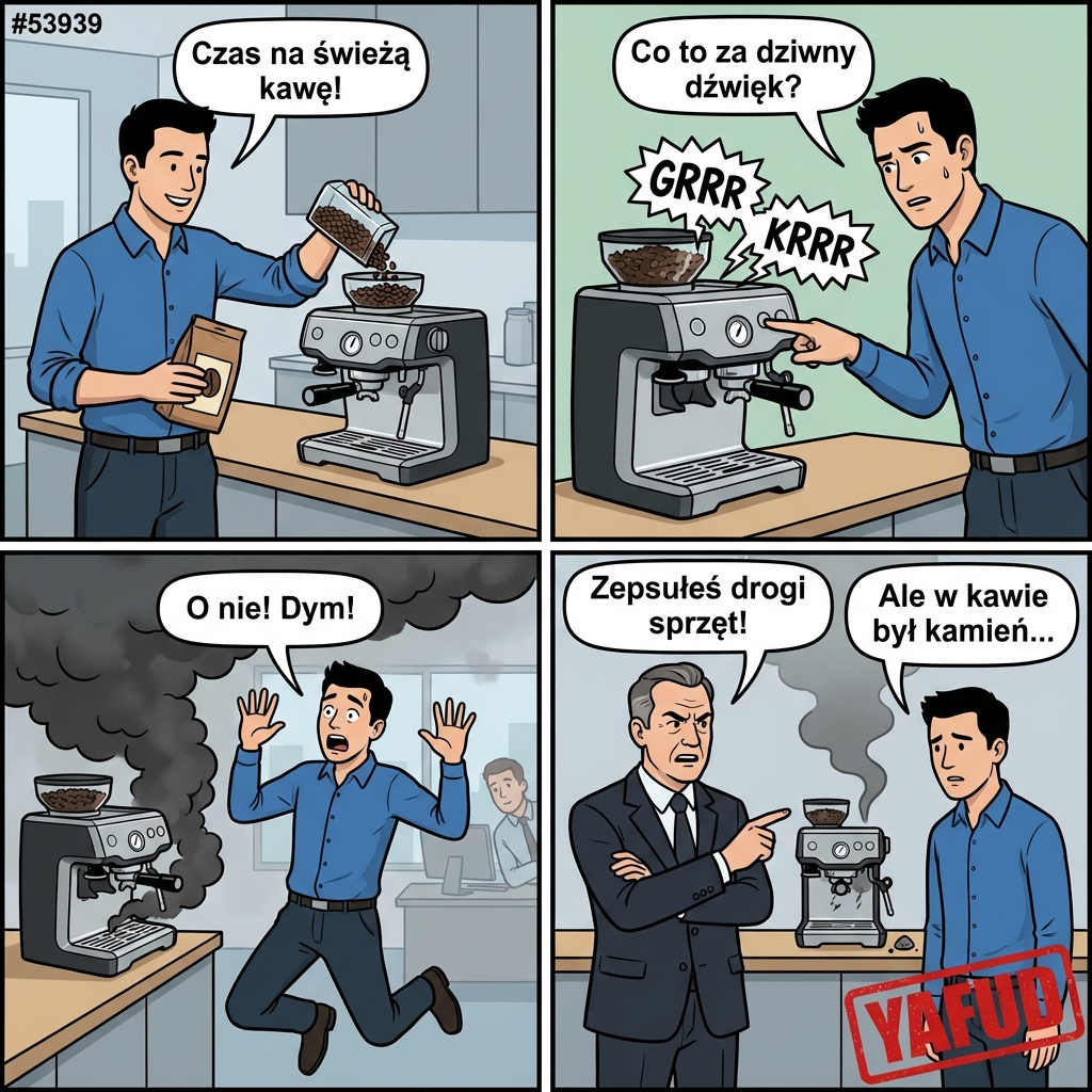 W biurze mamy ekspres do kawy, który mieli ziarna. Wsypałem świeżą kawę i włączyłem. Młynek zaczął wydawać dziwne dźwięki, a potem z ekspresu zaczął wydobywać się czarny dym. Okazało się, że w paczce kawy był mały kamień, który zablokował i spalił silnik młynka. Szef obwinia mnie o zepsucie drogiego sprzętu. YAFUD«Poprzednia wpadkaNastępna wpadka »