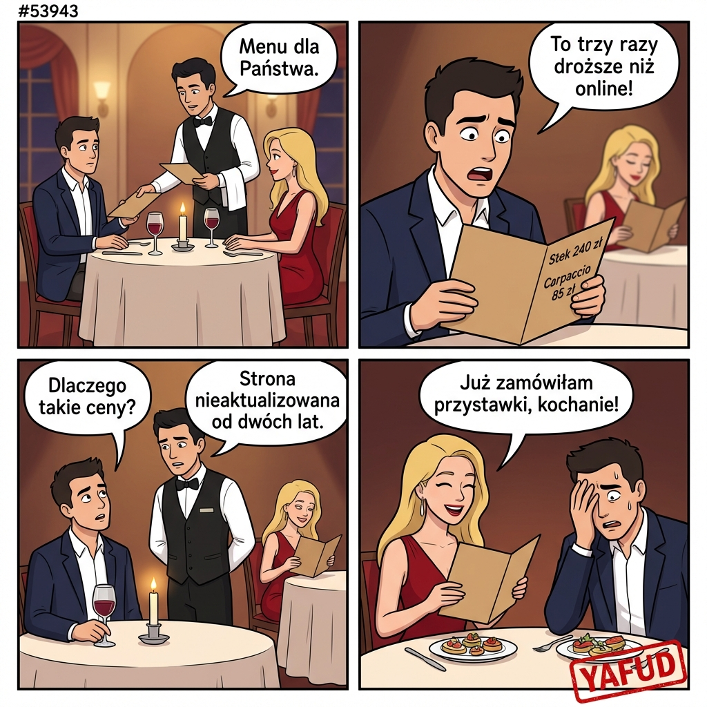 Zarezerwowałem stolik w restauracji na rocznicę ślubu. Kelner przyniósł menu i zauważyłem że ceny są trzy razy wyższe niż na stronie internetowej. Zapytałem o to a on powiedział że strona nie była aktualizowana od dwóch lat. Żona już zamówiła przystawki. YAFUD«Poprzednia wpadka