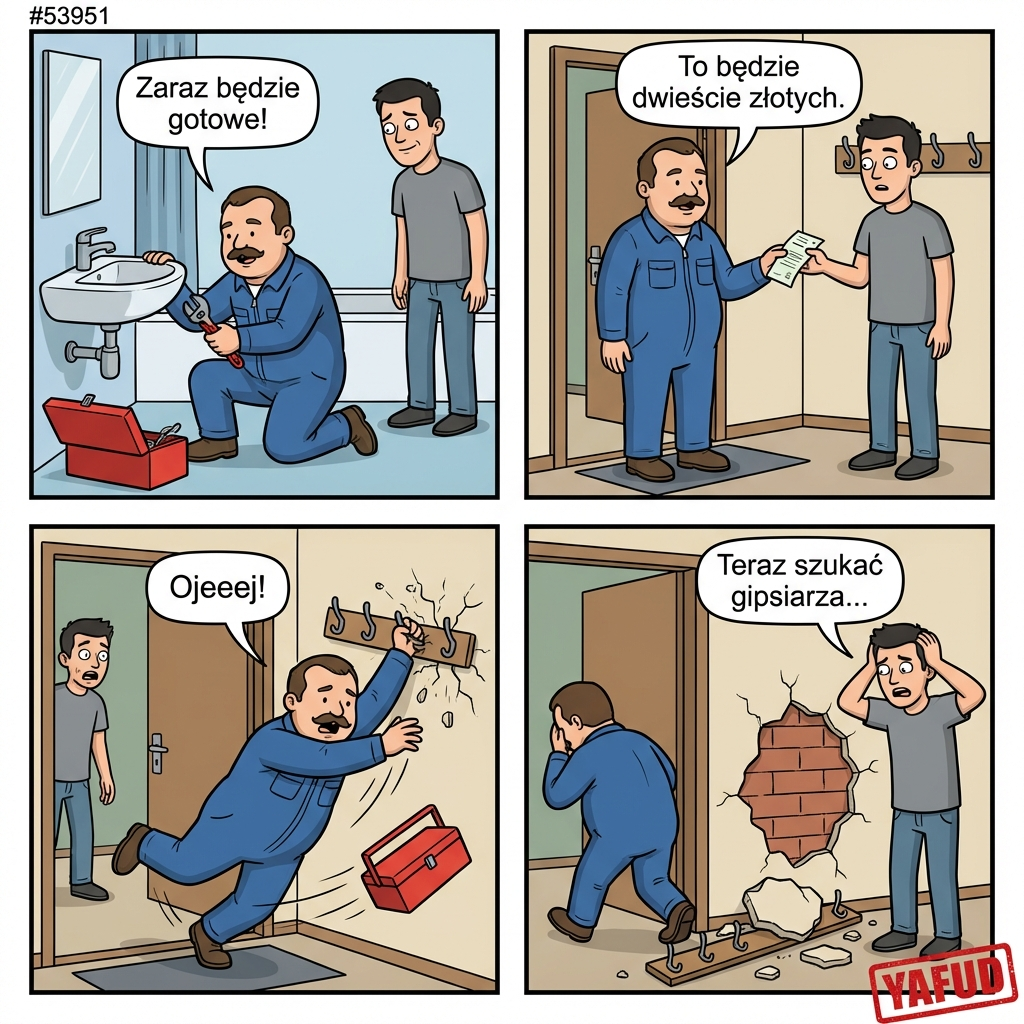 Zamówiłem hydraulika do cieknącego kranu. Fachowiec przyjechał, naprawił usterkę w dziesięć minut i wystawił rachunek. Kiedy wychodził, potknął się o próg i odruchowo złapał za wieszak na kurtki. Wieszak urwał się ze ściany razem z wielkim kawałkiem tynku. Kran działa, ale teraz muszę szukać kogoś do gipsowania przedpokoju. YAFUD«Poprzednia wpadkaNastępna wpadka »