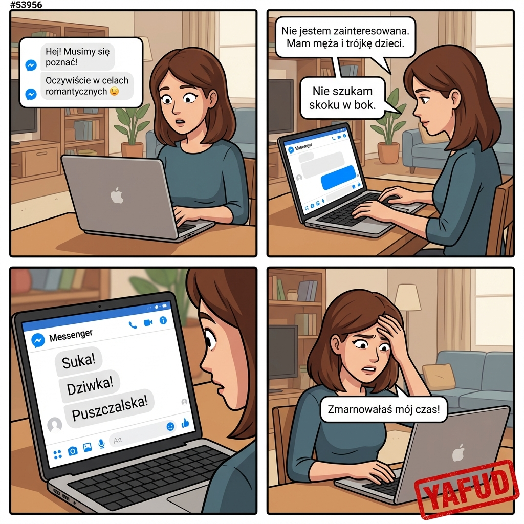 Zaczął do mnie pisać na Facebooku jakiś typ, który koniecznie chciał się poznać. Spytałam jaki charakter miałaby mieć nasza znajomość, on odpisał, że oczywiście charakter romantyczny. Napisałam mu zgodnie z prawdą, że nie jestem zainteresowana, bo mam męża i trójkę dzieci i absolutnie nie szukam skoku w bok. Wyraźnie w profilu mam status "w związku małżeńskim". Nie mam tylko zdjęć dzieci, bo dbam o ich prywatność. Koleś zaczął mnie wyzywać od suk, dzi**k, puszczalskich i temu podobnych, na koniec dodał, że zmarnowałam jego czas. YAFUD«Poprzednia wpadkaNastępna wpadka »