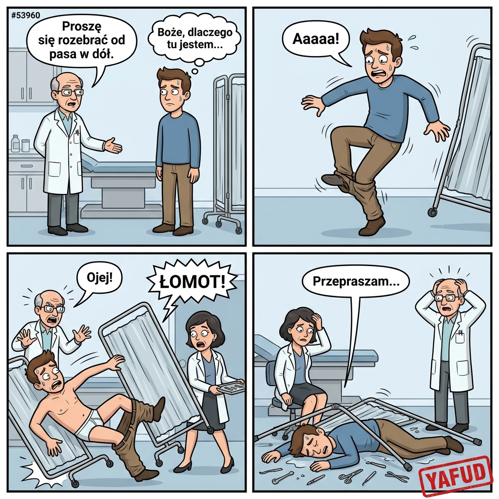 Miałem wizytę u proktologa. Byłem bardzo zestresowany. Lekarz poprosił, żebym się rozebrał od pasa w dół i położył na kozetce. Z nerwów zaplątałem się w nogawkę spodni, straciłem równowagę i przewróciłem parawan medyczny prosto na asystentkę, która wchodziła z tacą narzędzi. Huk był niesamowity, a ja leżałem w samej bieliźnie pod stertą metalowych rurek. YAFUD«Poprzednia wpadkaNastępna wpadka »