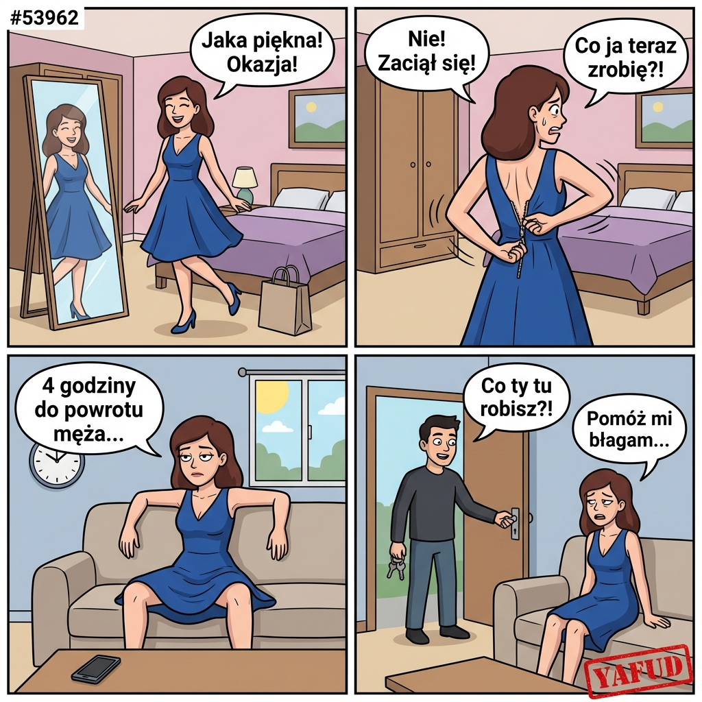 Kupiłam piękną sukienkę na wyprzedaży. W domu przymierzyłam ją jeszcze raz i zaciął się zamek błyskawiczny na plecach. Byłam sama w mieszkaniu. Musiałam czekać 4 godziny na powrót męża, siedząc uwięziona w sukience, w której nie dało się nawet usiąść wygodnie, żeby jej nie rozerwać. YAFUD«Poprzednia wpadkaNastępna wpadka »