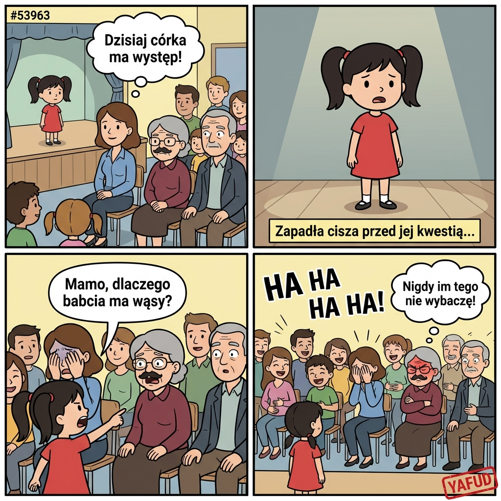 Moja córka miała występ w przedszkolu, na który zaprosiliśmy dziadków. W momencie, gdy na scenie zapadła cisza przed jej kwestią, głośno zapytała: „Mamo, a dlaczego babcia ma wąsy?”. Cała sala wybuchła śmiechem, a teściowa obraziła się na nas śmiertelnie. YAFUD«Poprzednia wpadka