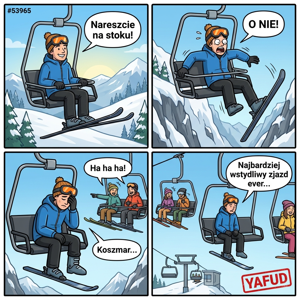 Pojechałem w góry na narty. Już przy pierwszym wjeździe wyciągiem krzesełkowym, upuściłem jedną nartę. Spadła w przepaść, gdzie nie ma dostępu dla narciarzy. Musiałem zjeżdżać na dół wyciągiem, słuchając śmiechów innych ludzi. YAFUD«Poprzednia wpadkaNastępna wpadka »
