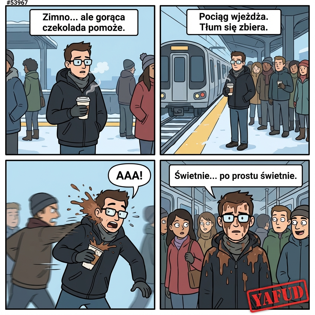 Czekałem na pociąg na peronie. Było zimno, więc kupiłem gorącą czekoladę w papierowym kubku. Pociąg wjechał, drzwi się otworzyły. Tłum ruszył do wejścia. Ktoś popchnął mnie od tyłu. Kubek zgniótł się w mojej dłoni, a gorąca czekolada wystrzeliła w górę, prosto na moją twarz i okulary. Wszedłem do pociągu wyglądając, jakbym brał udział w bitwie na jedzenie, z parującą twarzą. YAFUD«Poprzednia wpadkaNastępna wpadka »