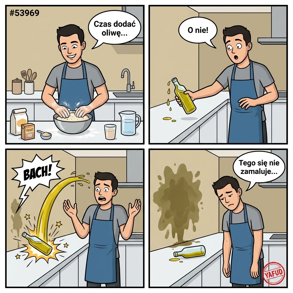 Robiłem ciasto na pizzę według sprawdzonego przepisu. Kiedy chciałem dodać oliwy, butelka wyślizgnęła mi się z ręki. Nie stłukła się, ale uderzyła o blat tak, że chlusnęła całą zawartością na świeżo pomalowaną ścianę w kuchni. Tłusta plama jest na samym środku i nie da się jej zamalować. YAFUD«Poprzednia wpadkaNastępna wpadka »