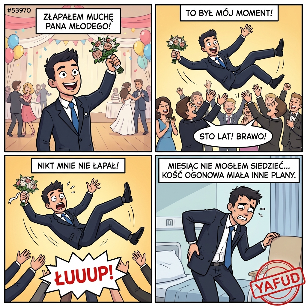 Byłem na weselu i złapałem muchę pana młodego. Wszyscy wiwatowali. Podrzucili mnie do góry, ale zapomnieli złapać. Upadłem na plecy i stłukłem sobie kość ogonową tak mocno, że nie mogłem siedzieć przez miesiąc. YAFUD«Poprzednia wpadkaNastępna wpadka »