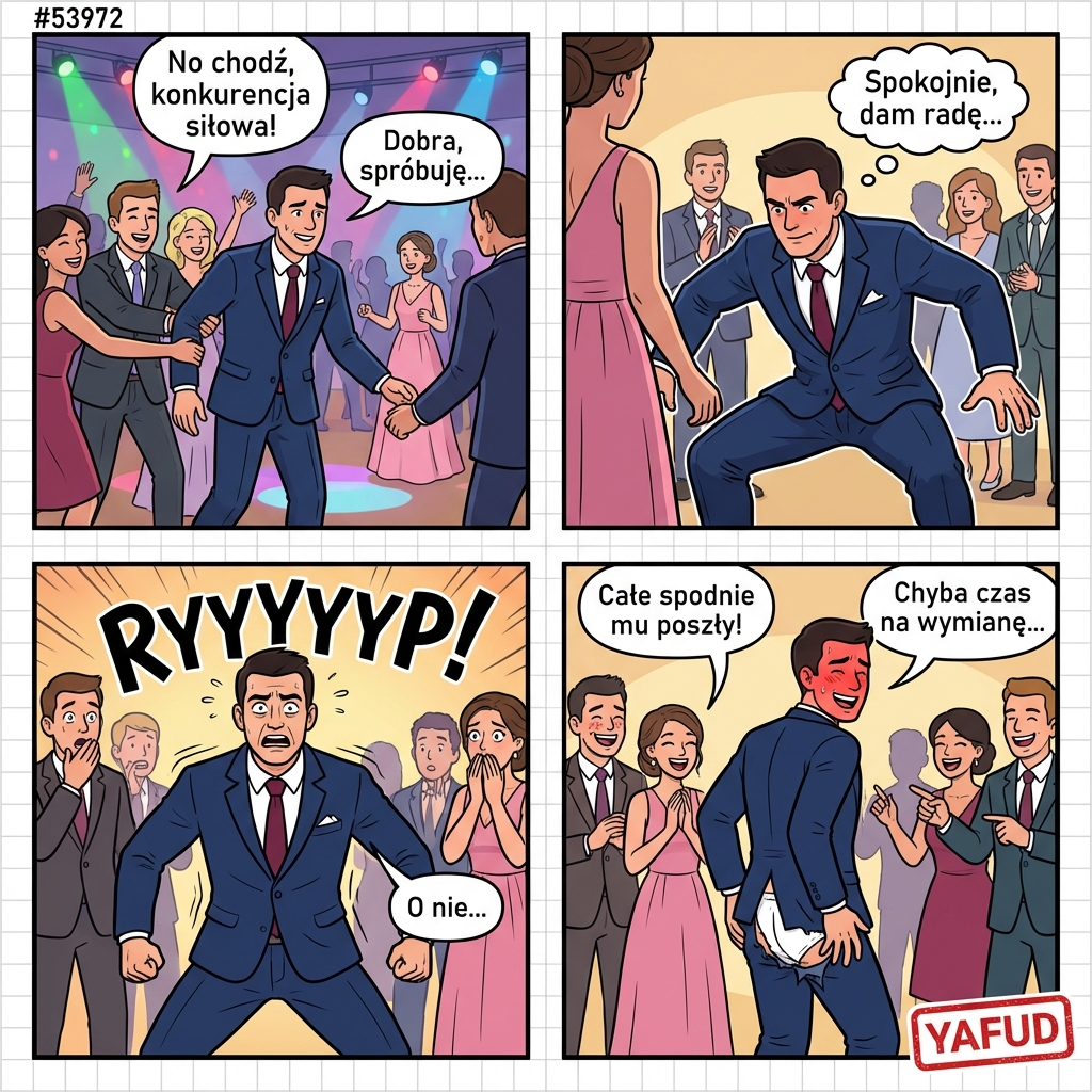 Byłem na weselu kuzyna i świetnie się bawiłem. Podczas oczepin zostałem wyciągnięty na środek do konkurencji siłowej. Miałem podnieść druhnę. Schyliłem się, napiąłem mięśnie i w tym momencie moje spodnie od garnituru pękły głośno na tyłku. Przez cały szew, od pasa aż do krocza. YAFUD«Poprzednia wpadka