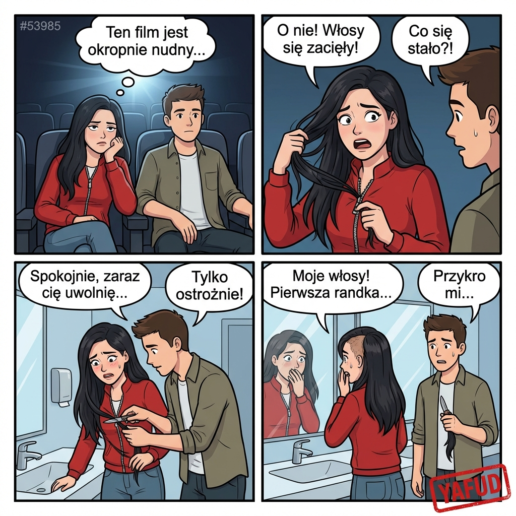 Poszłam na pierwszą randkę do kina. Film był nudny, więc zaczęłam bawić się suwakiem od kurtki. Pech chciał, że suwak wciągnął moje długie włosy i zaciął się na amen. Musieliśmy wyjść w połowie seansu do toalety, gdzie mój towarzysz przez 20 minut próbował mnie uwolnić scyzorykiem, ostatecznie wycinając mi spory kosmyk włosów. YAFUD«Poprzednia wpadka