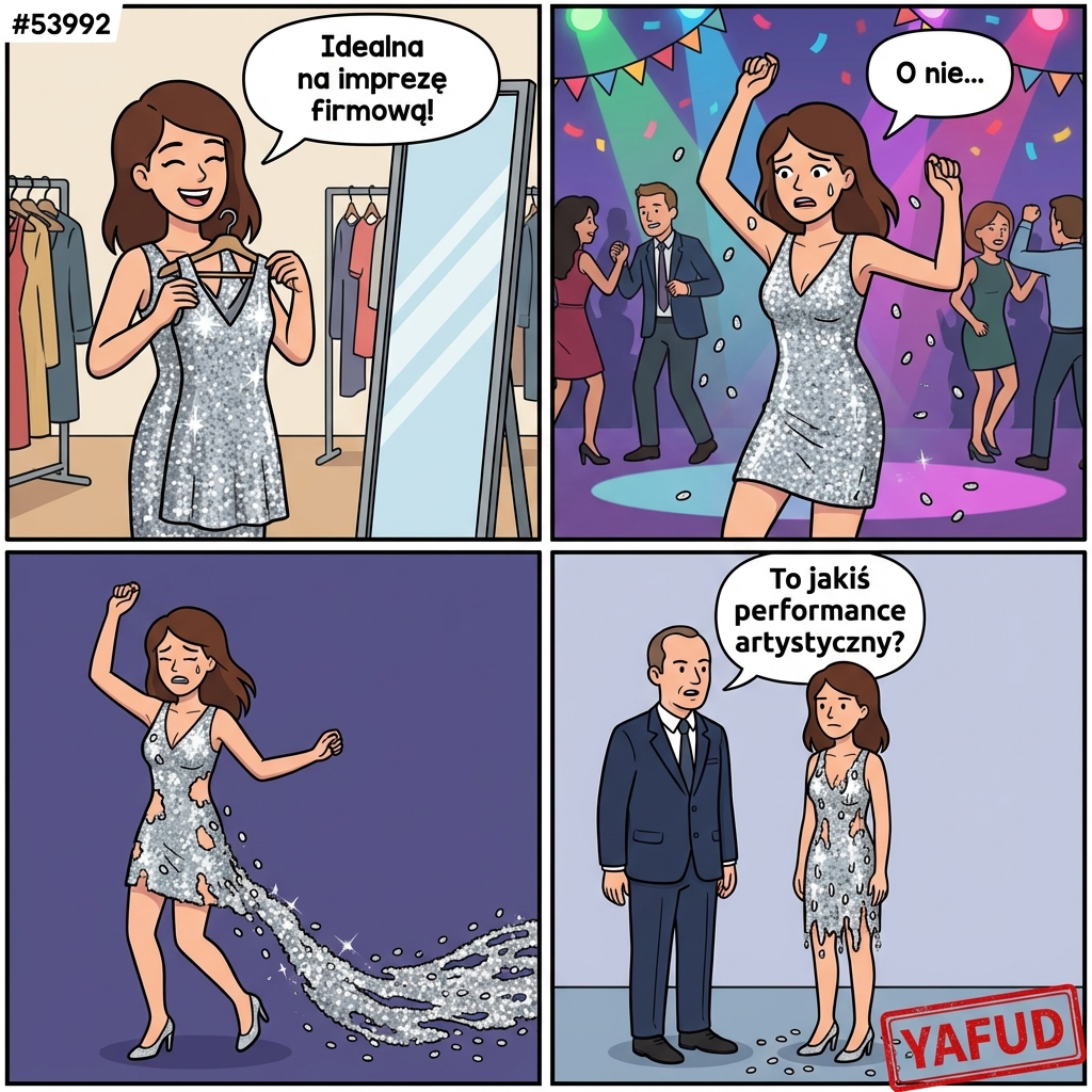 Kupiłam sukienkę z cekinami na imprezę firmową. Podczas tańca cekiny zaczęły odpadać jeden po drugim. Po godzinie wyglądałam jak wyliniała ryba, a za mną ciągnął się błyszczący ślad. Szef zapytał, czy to jakiś performance artystyczny. YAFUD«Poprzednia wpadkaNastępna wpadka »
