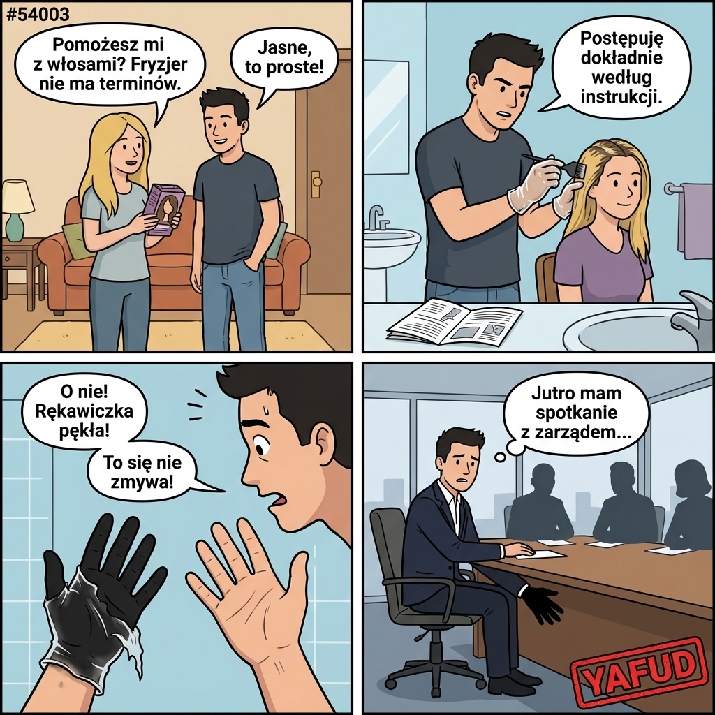 Moja dziewczyna poprosiła mnie o pofarbowanie jej włosów, bo fryzjer miał odległe terminy. Kupiła farbę w drogerii i zapewniła, że to proste. Postępowałem dokładnie według instrukcji na opakowaniu. Niestety, rękawiczka ochronna pękła mi na dłoni, czego nie zauważyłem. Teraz mam jedną dłoń w kolorze 'głęboka czerń', której nie da się niczym domyć, a jutro mam spotkanie z zarządem. YAFUD«Poprzednia wpadkaNastępna wpadka »