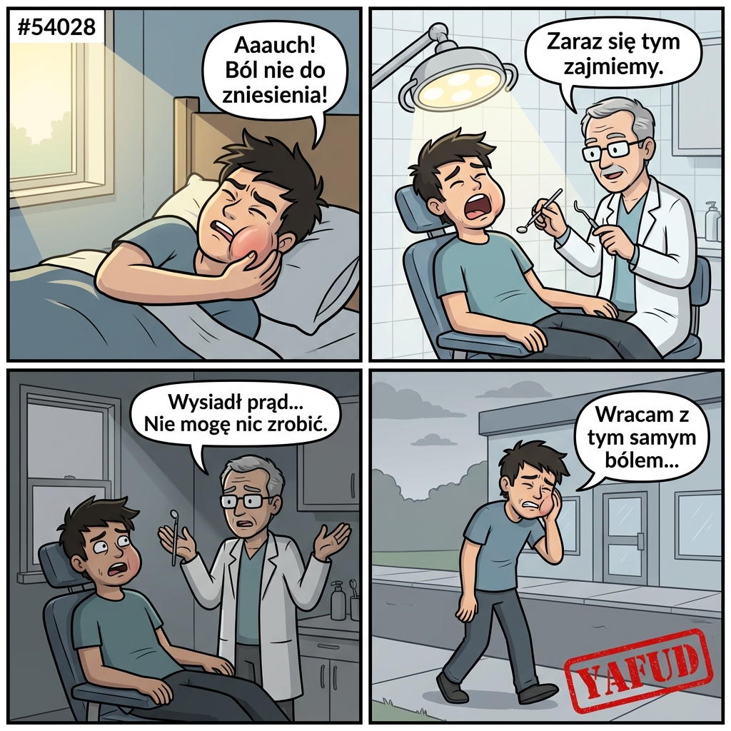 Obudziłem się z bólem zęba, który był nie do zniesienia. Udało mi się umówić na wizytę u dentysty w trybie pilnym tego samego dnia. Kiedy siedziałem już na fotelu z otwartą buzią, w całym gabinecie wysiadł prąd. Lekarz rozłożył ręce, a ja musiałem wracać do domu z pulsującym bólem. YAFUD«Poprzednia wpadkaNastępna wpadka »