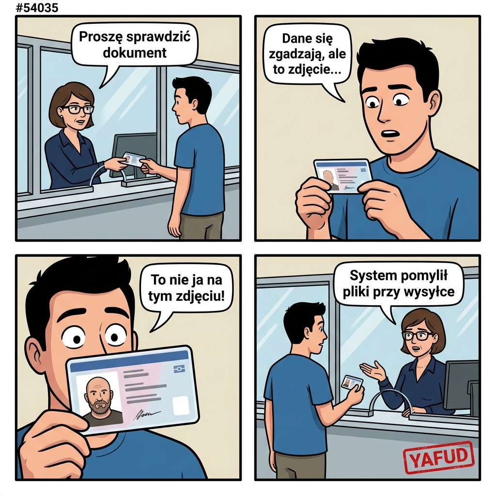 Poszedłem odebrać nowy dowód osobisty. Pani w okienku podała mi dokument do sprawdzenia. Wszystko się zgadzało, oprócz zdjęcia. Na fotografii był zupełnie obcy facet, chociaż dane były moje. Okazało się, że system pomieszał pliki przy wysyłce do wytwórni papierów wartościowych. YAFUD«Poprzednia wpadkaNastępna wpadka »