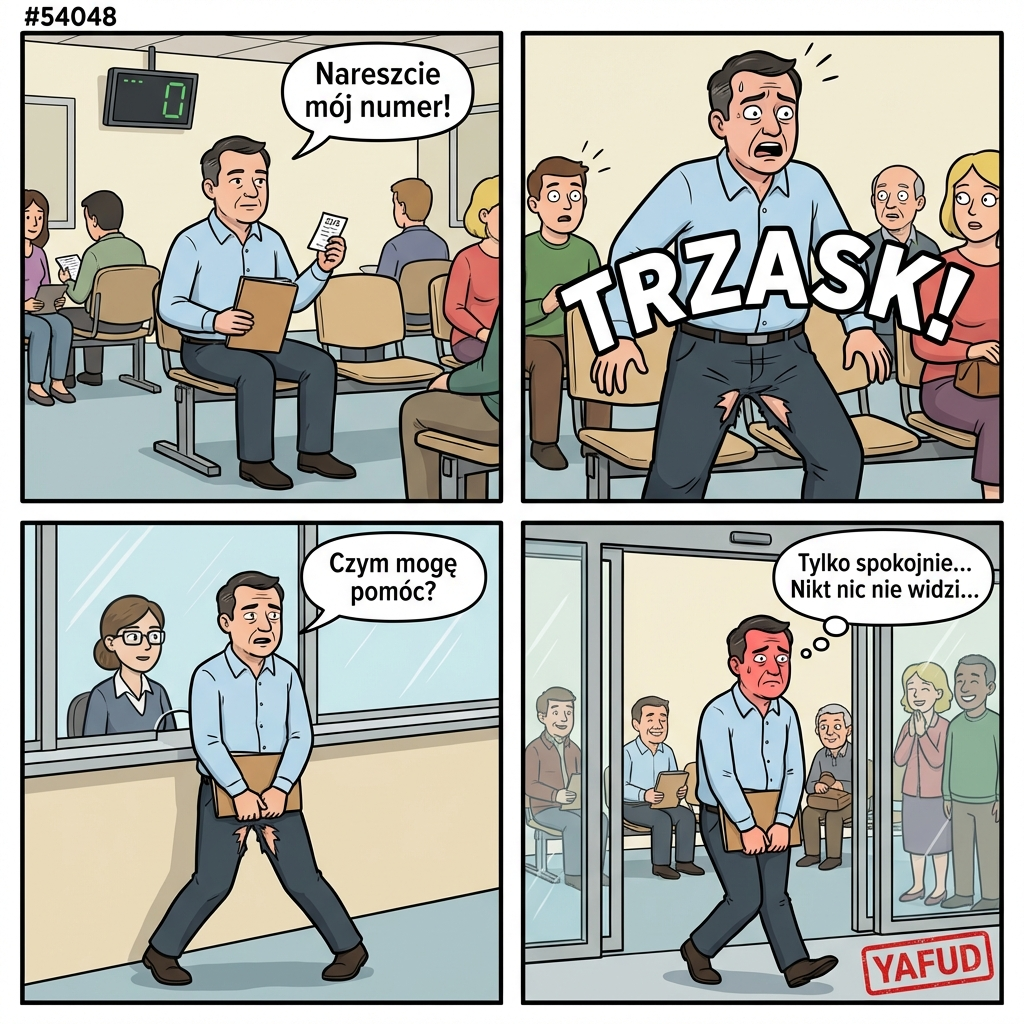 Miałem do załatwienia sprawę w ZUS-ie. Wziąłem numerek i czekałem. Kiedy wyświetlił się mój numer, wstałem gwałtownie i spodnie pękły mi w kroku na całej długości. Wszyscy w poczekalni to usłyszeli. Podszedłem do okienka, zasłaniając się teczką, załatwiłem sprawę stojąc nienaturalnie bokiem i wyszedłem chodem pingwina. YAFUD«Poprzednia wpadkaNastępna wpadka »