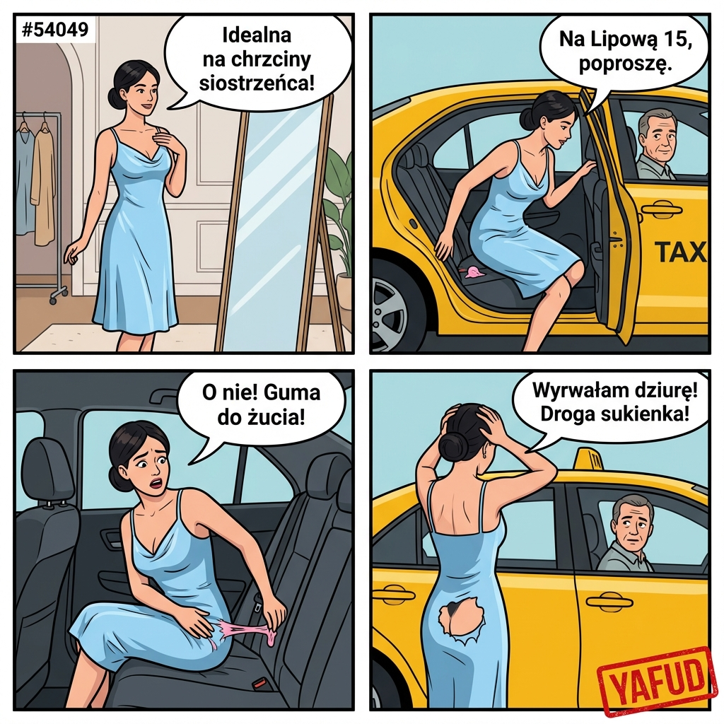 Kupiłam sobie piękną, jedwabną sukienkę na chrzciny siostrzeńca. Była droga, ale leżała idealnie. Wyszłam z domu i wsiadłam do taksówki. Okazało się, że na siedzeniu była przyklejona guma do żucia, której nie zauważyłam. Próba usunięcia jej skończyła się wyrwaniem dziury w materiale na samym środku pośladka. YAFUD«Poprzednia wpadkaNastępna wpadka »