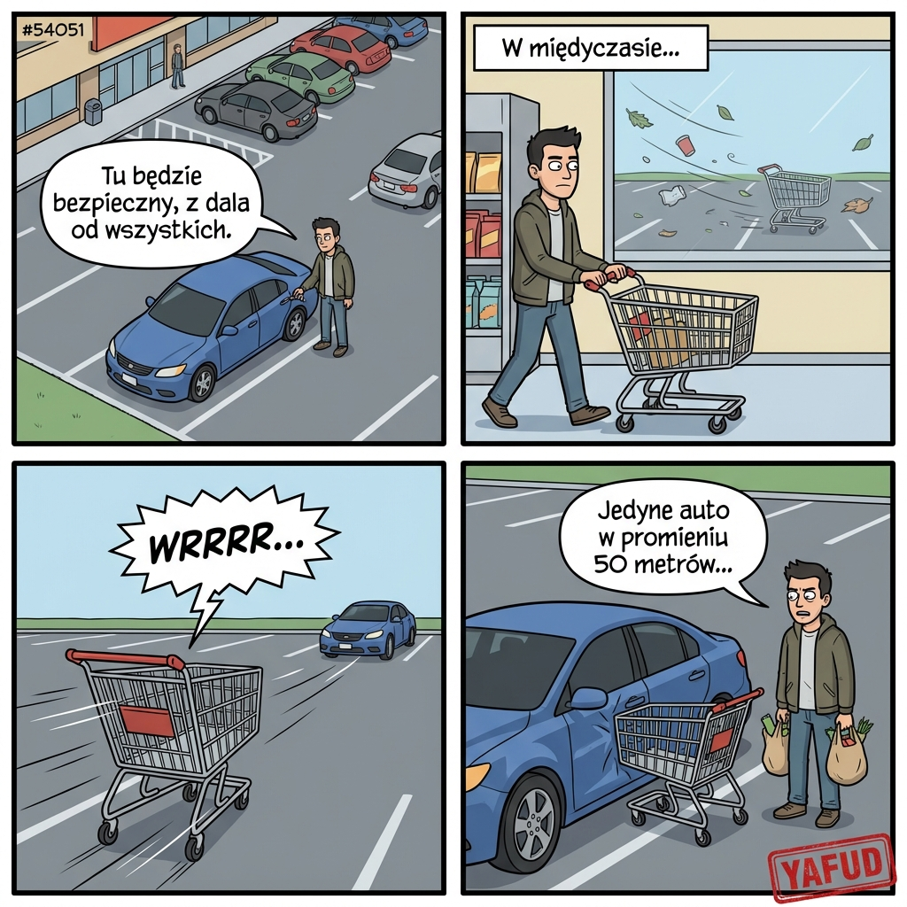 Dbałem o swój samochód jak o dziecko, zawsze parkując z dala od innych aut pod supermarketem. Wczoraj też tak zrobiłem, zostawiając auto na szarym końcu parkingu. Wróciłem po zakupach i zobaczyłem, że w moje drzwi wbił się wózek sklepowy zniesiony przez wiatr przez całą długość placu. Jedyne auto w promieniu 50 metrów i to w nie trafiło. YAFUD«Poprzednia wpadka