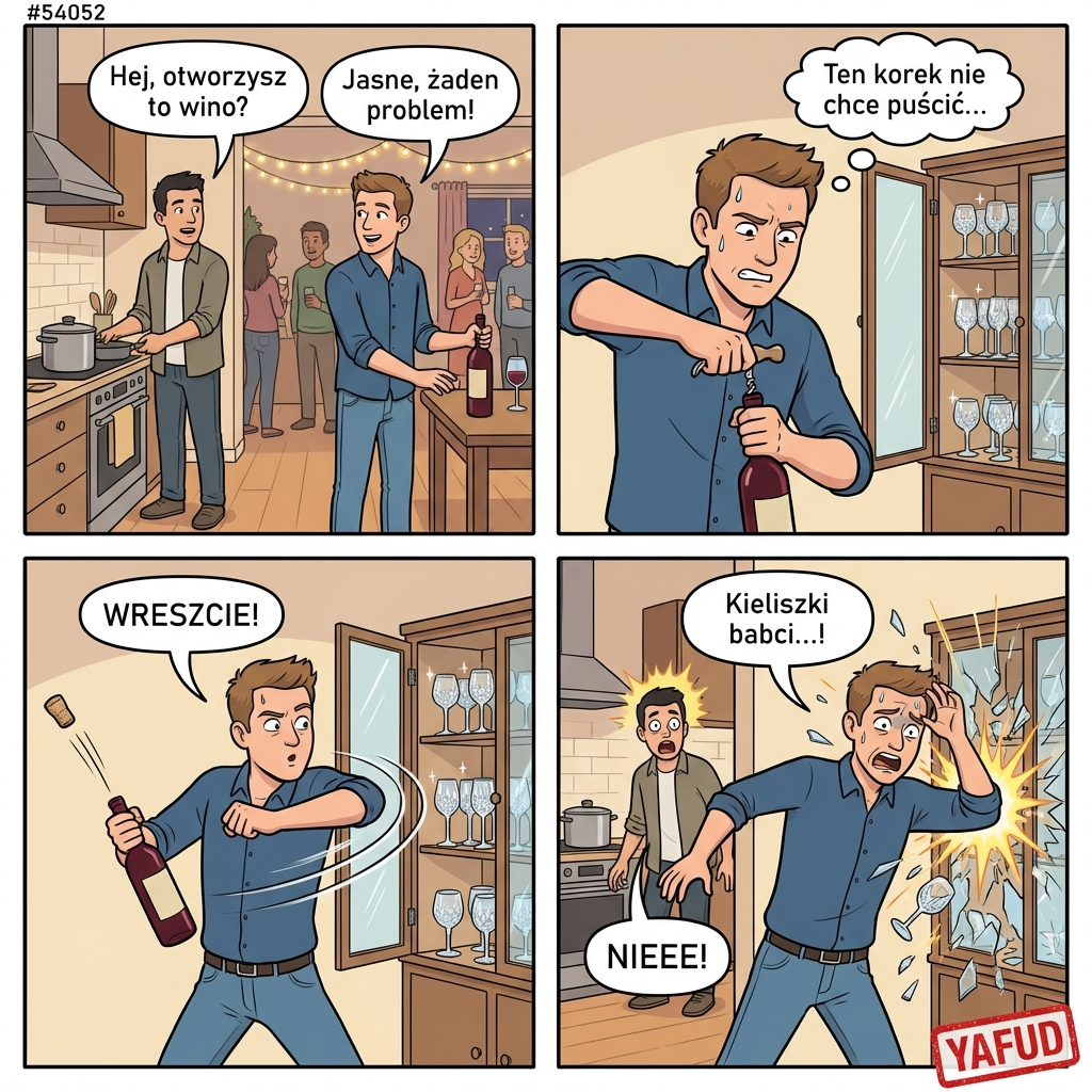 Byłem na domówce u znajomych, atmosfera była świetna. Gospodarz poprosił mnie o otwarcie wina, bo sam był zajęty w kuchni. Użyłem korkociągu, ale korek był wyjątkowo oporny. Pociągnąłem mocniej, korek puścił, a ja z impetem uderzyłem łokciem w otwartą witrynę z kolekcją kryształowych kieliszków babci gospodarza. YAFUD«Poprzednia wpadkaNastępna wpadka »