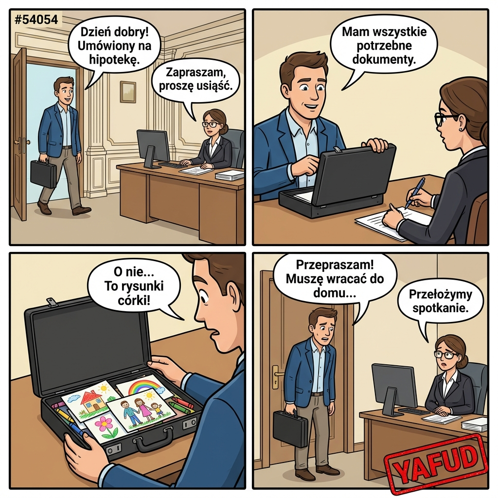 Umówiłem się na spotkanie z doradcą kredytowym w banku, żeby omówić warunki hipoteki. Przygotowałem teczkę ze wszystkimi niezbędnymi dokumentami i zaświadczeniami. Gdy usiedliśmy do rozmowy, zorientowałem się, że wziąłem teczkę z rysunkami mojej córki zamiast dokumentów. Musiałem wracać do domu i przekładać spotkanie. YAFUD«Poprzednia wpadkaNastępna wpadka »