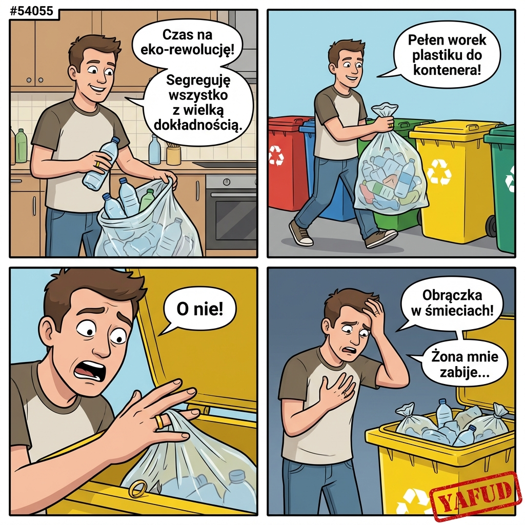Chciałem być eko i zacząłem segregować śmieci z wielką dokładnością. Uzbierałem pełen worek plastikowych butelek i poszedłem go wyrzucić do odpowiedniego kontenera. Gdy wrzucałem worek, zaczepiłem obrączką o metalową krawędź pojemnika. Obrączka zsunęła się z palca i wpadła prosto do wnętrza pełnego śmieci. YAFUD«Poprzednia wpadkaNastępna wpadka »