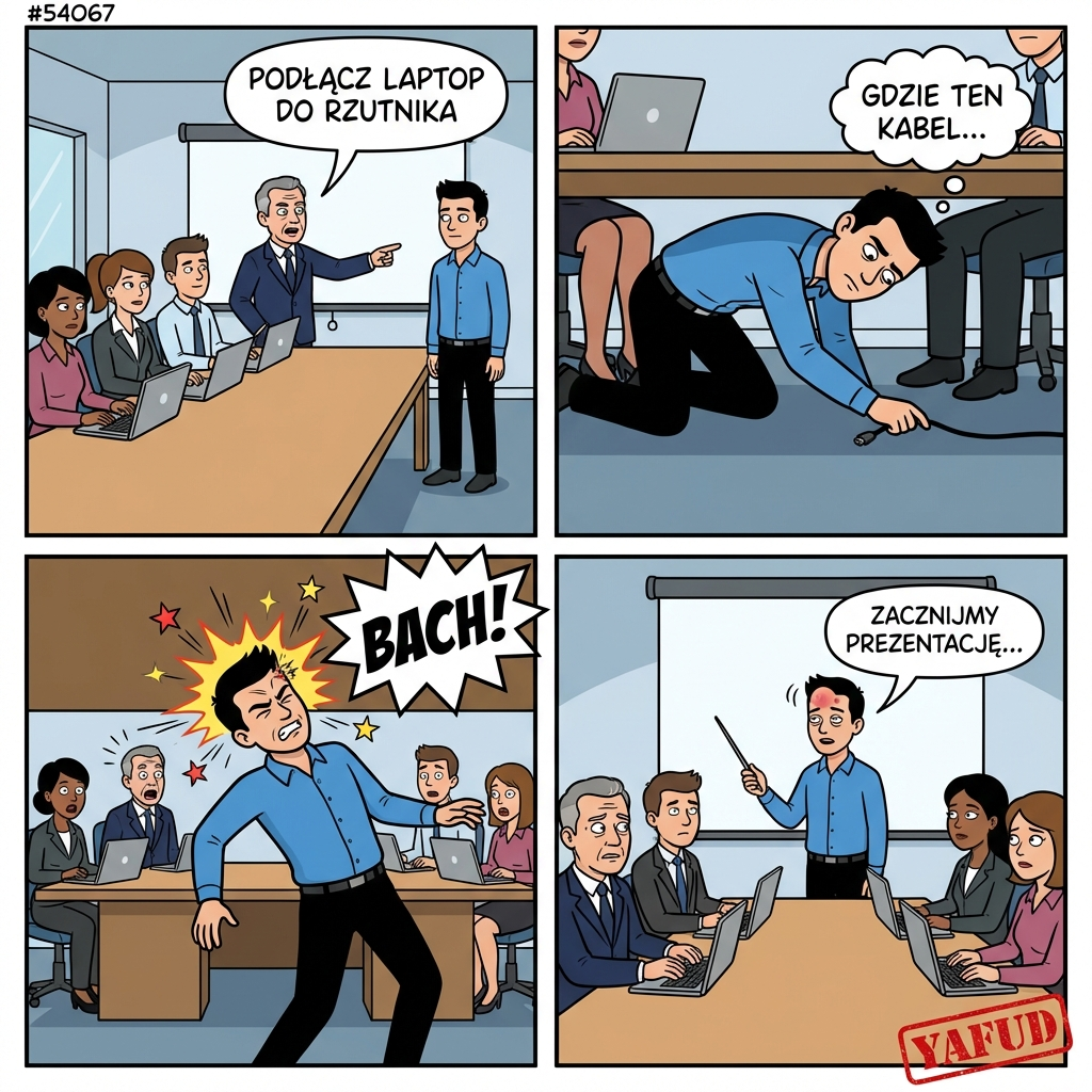 Na spotkaniu zespołu szef poprosił mnie o podłączenie laptopa do rzutnika. Schyliłem się pod stół, żeby znaleźć kabel. Gdy wstawałem, uderzyłem głową w blat stołu z taką siłą, że aż zadzwoniło mi w uszach. Wszyscy zamilkli, a ja musiałem prowadzić prezentację z rosnącym guzem na czole i lekkimi zawrotami głowy. YAFUD«Poprzednia wpadka