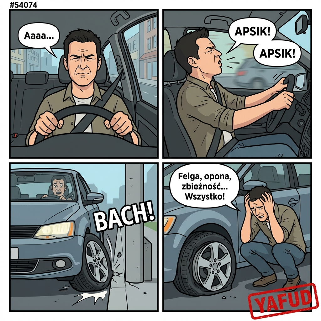 Dostałem ataku kichania podczas prowadzenia samochodu. Przy trzecim kichnięciu szarpnąłem kierownicą i wjechałem prawym kołem na wysoki krawężnik. Felga jest zgięta, opona pękła, a zbieżność kół kompletnie się rozjechała. YAFUD«Poprzednia wpadkaNastępna wpadka »