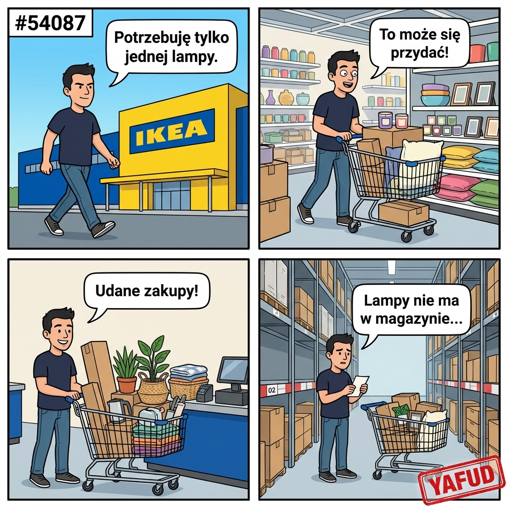 Pojechałem do Ikei po jedną lampę. Trzy godziny później wyszedłem z wózkiem pełnym rzeczy, których nie potrzebowałem. Lampy nie było w magazynie. YAFUD«Poprzednia wpadkaNastępna wpadka »