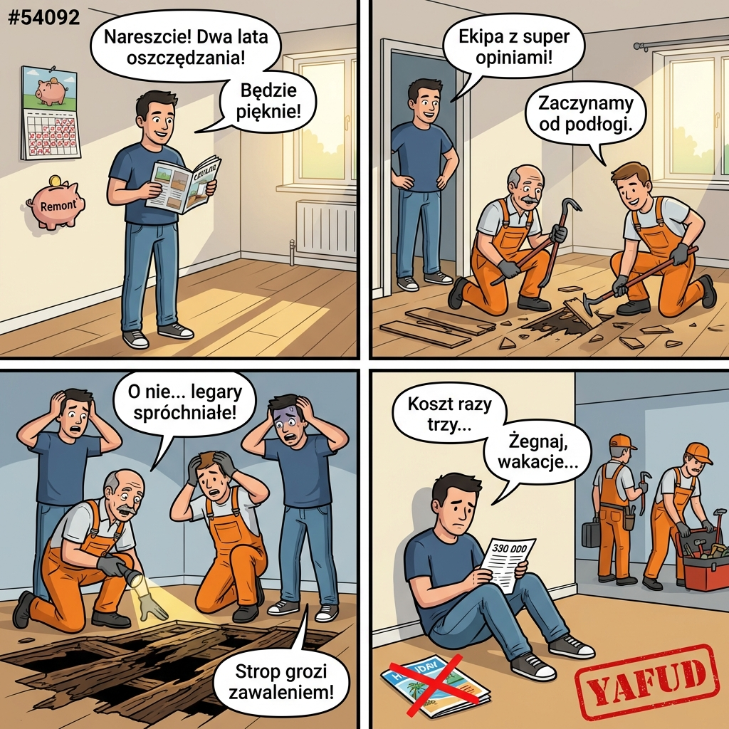Zdecydowałem się na generalny remont sypialni, oszczędzając na to przez dwa lata. Wynająłem ekipę, która miała świetne opinie w internecie. Pierwszego dnia pracy panowie zaczęli od zrywania podłogi. Okazało się, że pod panelami, które wyglądały całkiem nieźle, legary są całkowicie spróchniałe, a strop grozi zawaleniem. Koszt remontu wzrósł trzykrotnie w ciągu pierwszych piętnastu minut, pochłaniając nie tylko oszczędności na remont, ale i te na wakacje. YAFUD«Poprzednia wpadka
