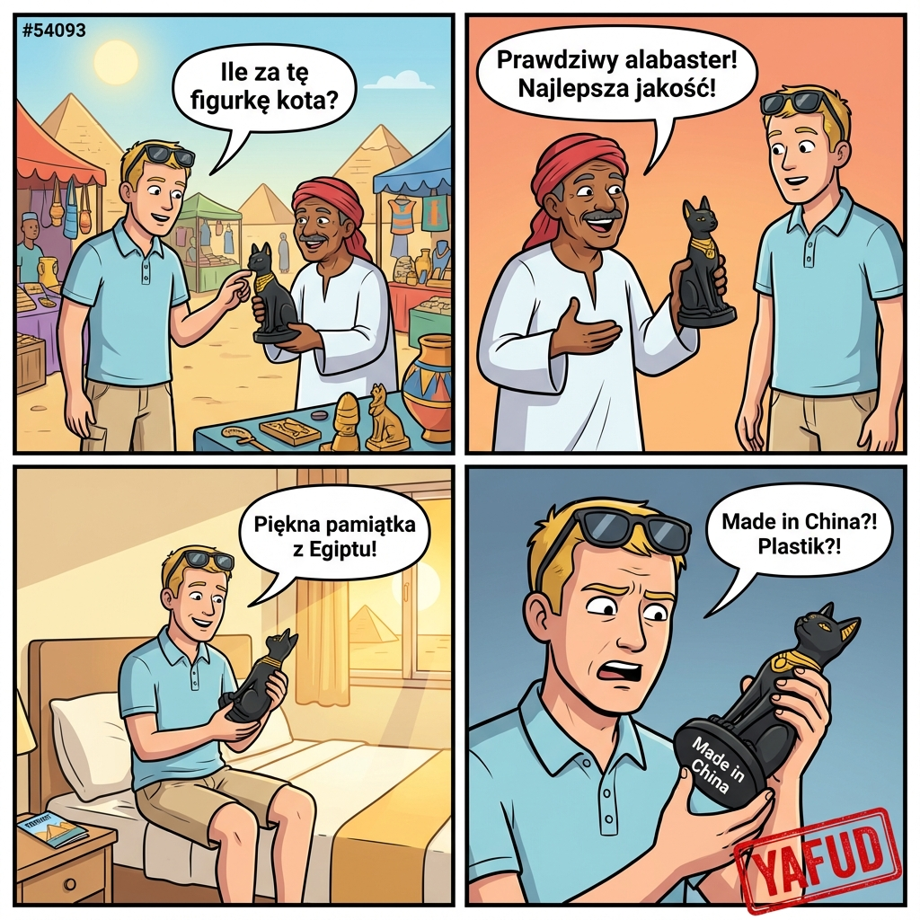 Byłem na wakacjach w Egipcie i poszedłem na targ. Kupiłem pamiątkową figurkę kota. W hotelu okazało się, że figurka ma na spodzie napis 'Made in China' i jest z plastiku, a nie z alabastru, jak zapewniał sprzedawca. YAFUD«Poprzednia wpadkaNastępna wpadka »