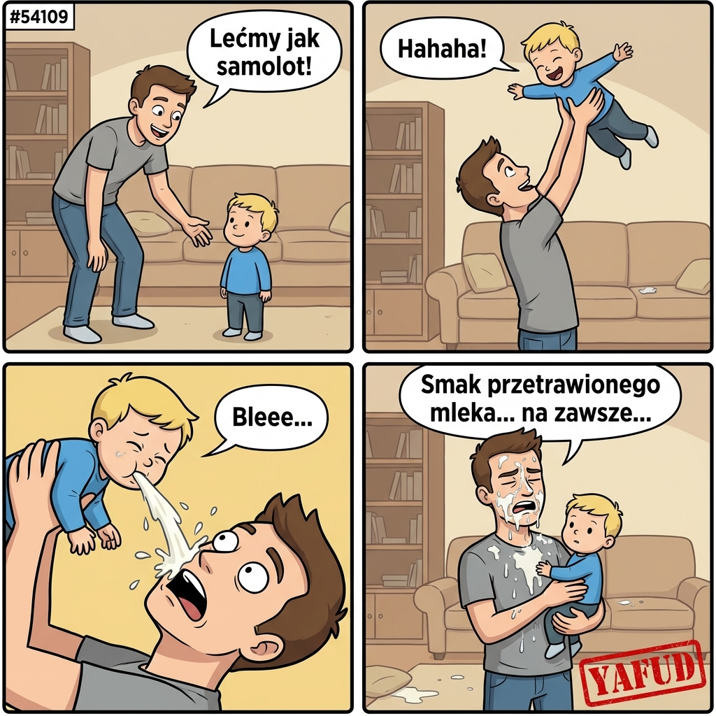 Bawiłem się z moim dwuletnim synem w „samolot”. Podnosiłem go wysoko do góry, a on śmiał się wniebogłosy. W pewnym momencie, gdy był dokładnie nad moją twarzą, ulało mu się mleko. Nie zdążyłem zamknąć ust ani oczu. Smak przetrawionego mleka modyfikowanego zostanie ze mną na zawsze. YAFUD«Poprzednia wpadka