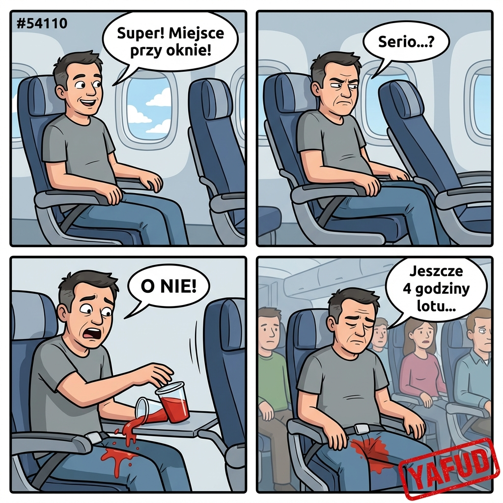 Leciałem samolotem na wakacje. Siedziałem przy oknie, co bardzo mnie cieszyło. Niestety, pasażer przede mną rozłożył fotel na maksymalną możliwą odległość w tył. Kiedy stewardesa podawała napoje, chciałem postawić swój sok pomidorowy na stoliku. Przez brak miejsca, ruch fotela poprzedzającego strącił kubek prosto na moje krocze. Przez 4 godziny lotu wyglądałem, jakbym miał krwotok w bardzo niefortunnym miejscu. YAFUD«Poprzednia wpadkaNastępna wpadka »