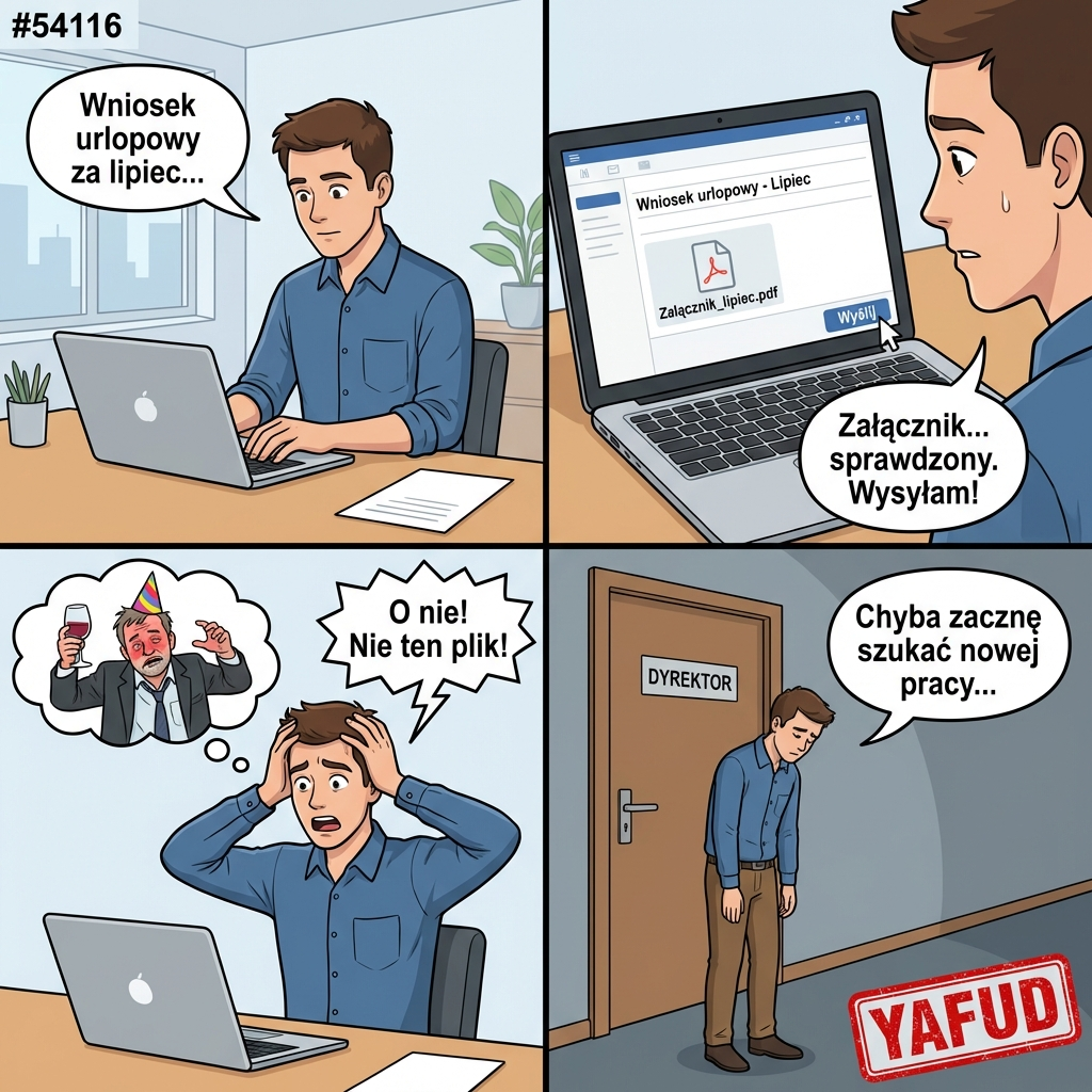Wysłałem do szefa maila z prośbą o urlop. Przez przypadek dołączyłem do niego plik ze zdjęciami z imprezy firmowej, na których szef wcale nie wyszedł korzystnie. YAFUD«Poprzednia wpadka